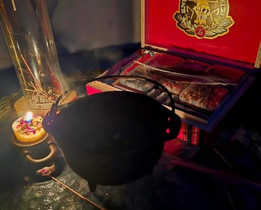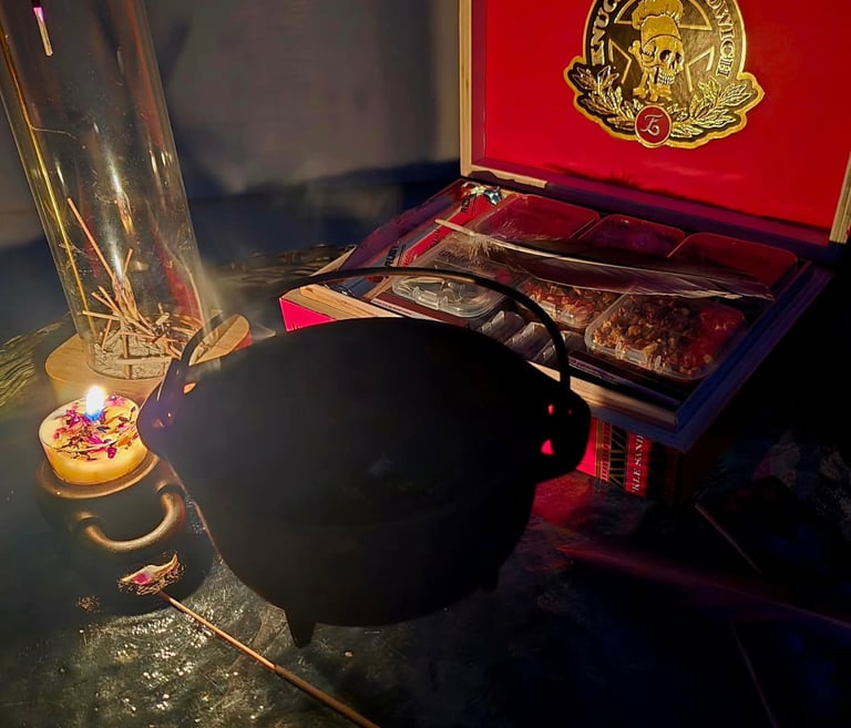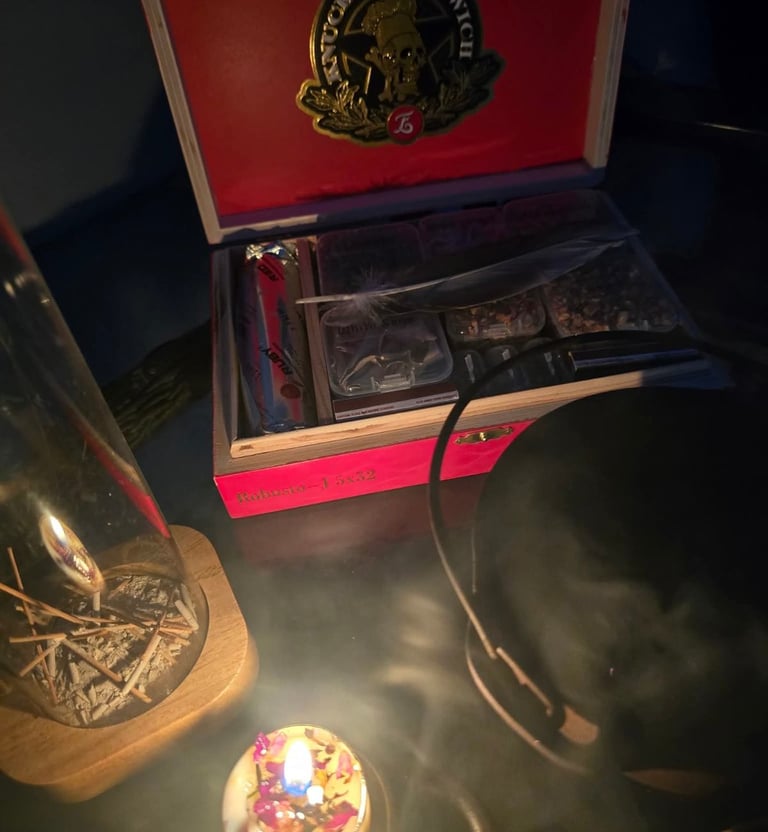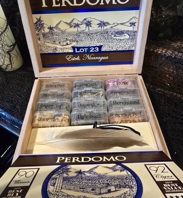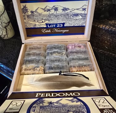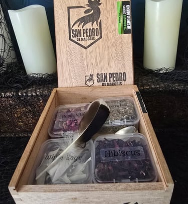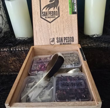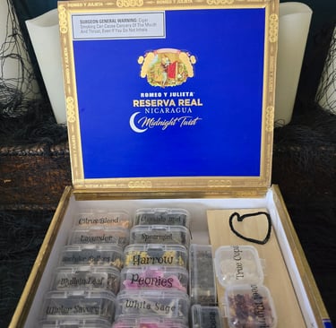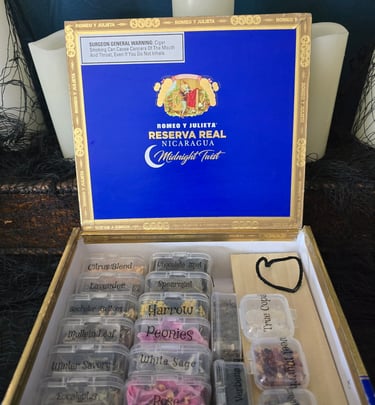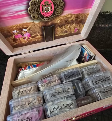 Cigar boxes carefully repurposed with the aim of fostering a serene, calming, and significant environment for meditation, ritual, or personal introspection. The boxes feature an assortment of herbs, flowers, bark, and often include citrus peel. They are intended to be burned on charcoal (Included in the box) to emit aromatic smoke.